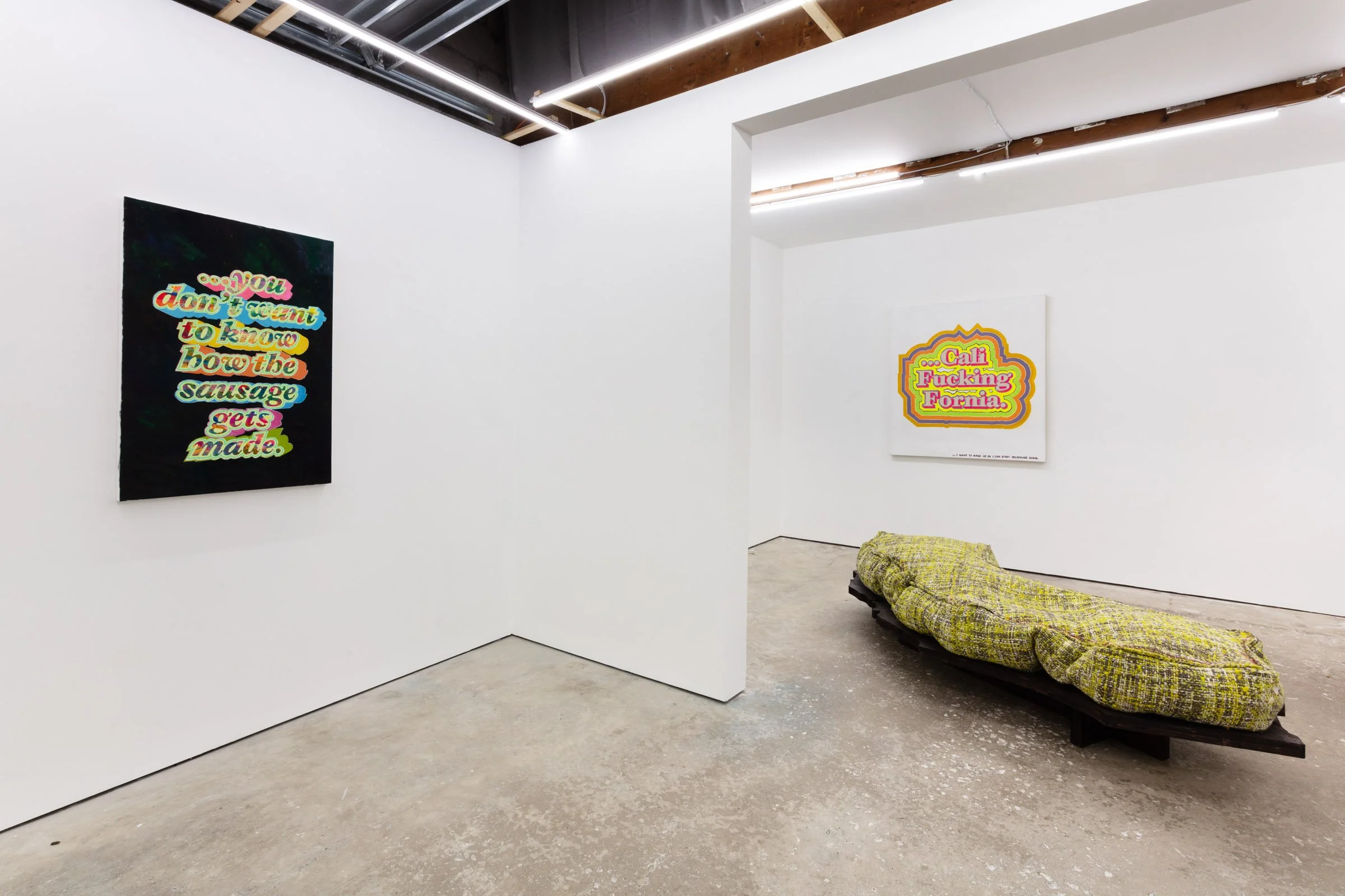 For California Dreaming Through the Prism of the iPhone, Kramer has created paintings and a soft sculpture/bean bag chair. The painting styles range between somewhat representational, hard-edged work, to more loosely abstract color field. To Kramer, it is the text that carries the message, and the painted imagery lends a supportive juxtaposition to the composition.