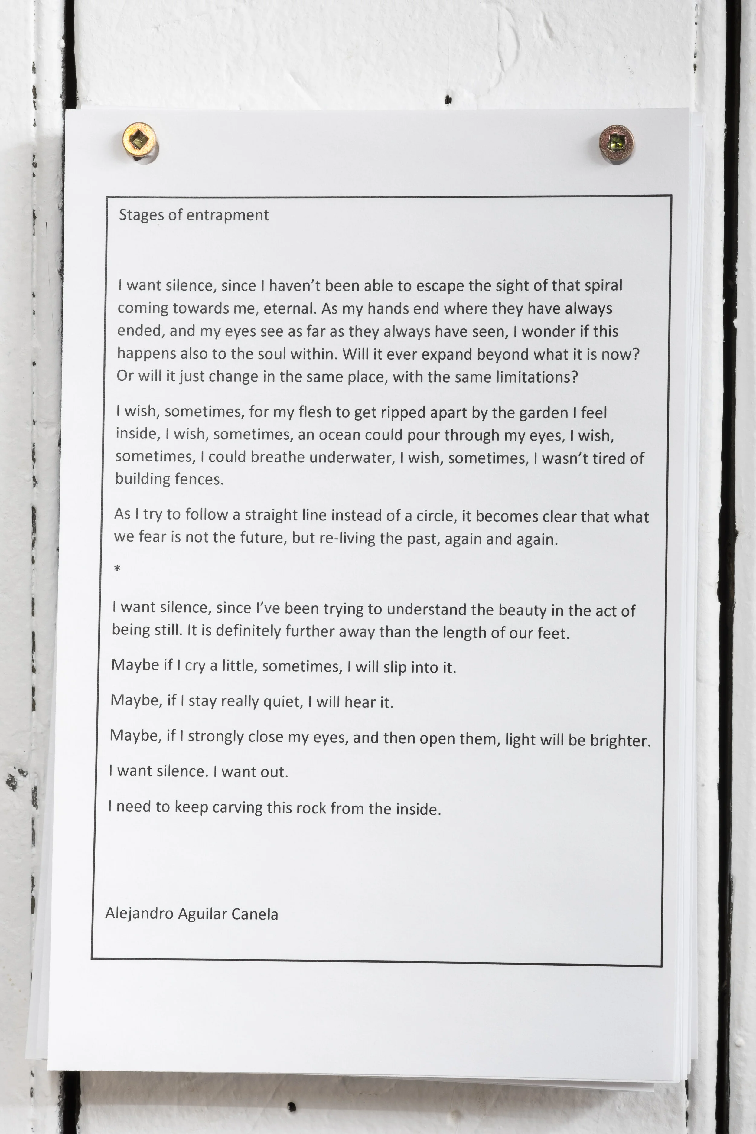 I want silence, since I haven’t been able to escape the sight of that spiral coming towards me, eternal. As my hands end where they have always ended, and my eyes see as far as they always have seen, I wonder if this happens also to the soul within. Will it ever expand beyond what it is now? Or will it just change in the same place, with the same limitations?