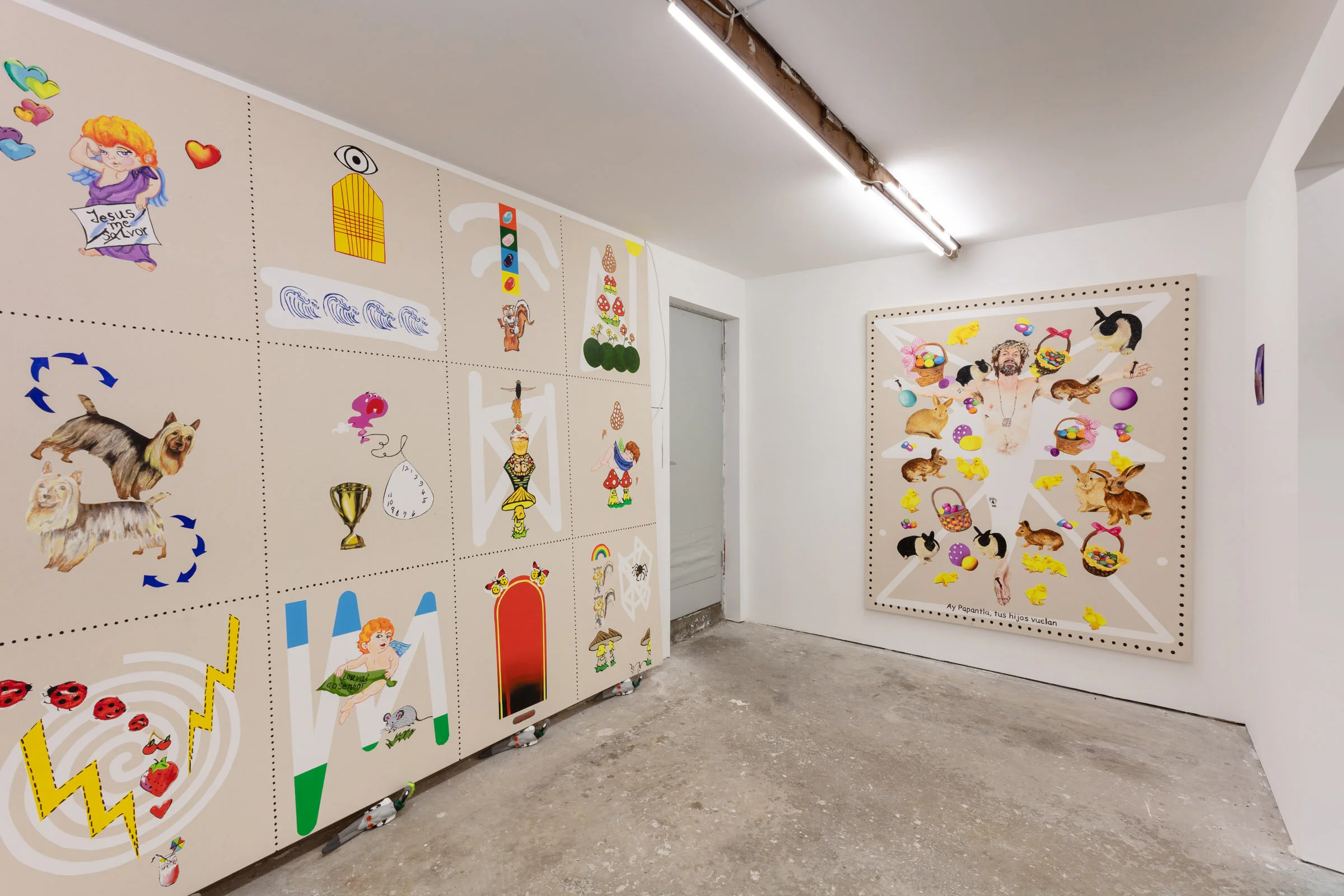 Through large scale textile and reclaimed leather pieces, Minerva Ayon opens up a conversation about desire, rituals and stillness. The scale of her pieces enters a visual back-and-forth with David Bellemare's mural-sized collage-paintings in which he emulates an old school (90's) sticker sheet.